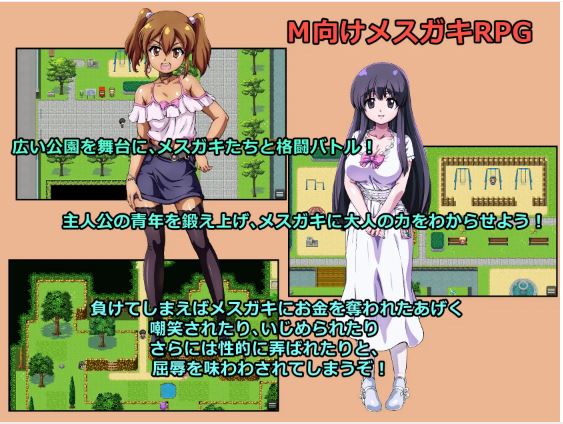 说:“如果你不照我说的做,我就报警。” 主角不知所措之际,女孩们提议进行一场游戏: 以公园为场地 ,进行女孩与主角之间的捉人大战。 规则是:如果主角被其中一名女孩抓住,两人必须战斗,如果 失败,则损失10,000日元。如果主角 屡败屡战,钱用完,则彻底失败, 可以随意调戏。 如果主角持续获胜并达到目标,她们将不会拿走他的钱,而是 被释放,不会被举报。 在她们的威胁下, 主角别无选择,只能与她们玩游戏。 主角能否击退女孩们, 安全地保护他的钱和自尊呢? ●游戏概述游戏 从大公园的西侧开始, 设置在广阔的区域,目标是到达东出口并逃脱。 然而,公园里挤满了女孩,她们 会攻击主角,试图偷走他的钱。 与女◯垣接触会引发战斗。 失败不仅会损失金钱, 根据情况,甚至可能遭到女◯垣的性侵犯。 在金钱全部损失之前,从公园东出口逃走。输给 女◯垣的首领真子和绘里奈, 可能会引发逆强奸等羞辱性的H场景。 在比拼技能的战斗中,体验被比自己年轻、脾气暴躁的女◯垣打败的羞辱,以及 被性侵犯和嘲笑的耻辱 。 ●H场景 女◯垣真子和绘里奈是 组合名风潭“茂柴杏子 ”的原创人物。众多羞辱性的失败场景可供选择,技能图像也多种多样。 游戏的最大特点是 失败的H场景会根据击败你的技能而变化。 如果臀部攻击失败,你的屁股就会压在对手的脸上被玩弄 ,或者如果你的内裤暴露的高踢失败,你的胯部就会被踩踏 。根据地点和其他条件,还会发生 H 场景。 当然,大多数 H 场景都是针对受虐狂的。 ● 活动 CG 数量 由 Nafutan 创建的活动 CG 计划包含总共 30 多个基本 CG。除了 H 场景之外,它们还包括 Me-Kaki 所使用技术的图形。 大多数 CG 将以主角“Mako”和“Erina ”为特色